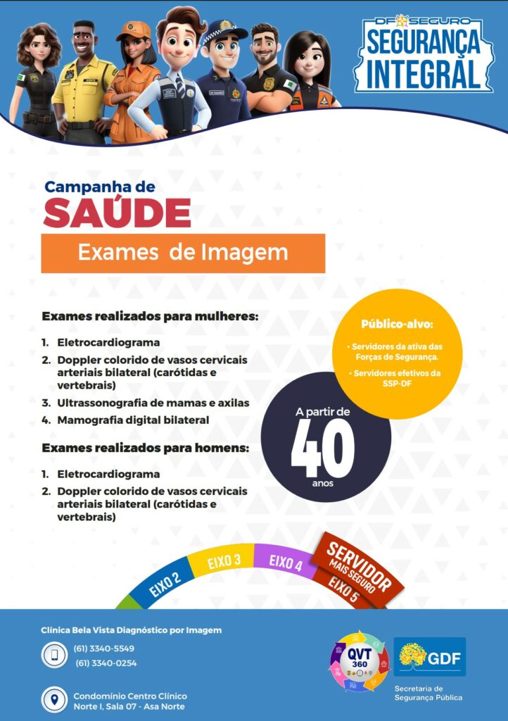 Com o objetivo de promover a assistência integral e a prevenção de doenças, a Secretaria de Segurança Pública (SSP), em parceria com o Corpo de Bombeiros Militar do Distrito Federal (CBMDF) e demais forças de segurança, anuncia a abertura de exames gratuitos de rastreio cardiovascular e de câncer de mama.