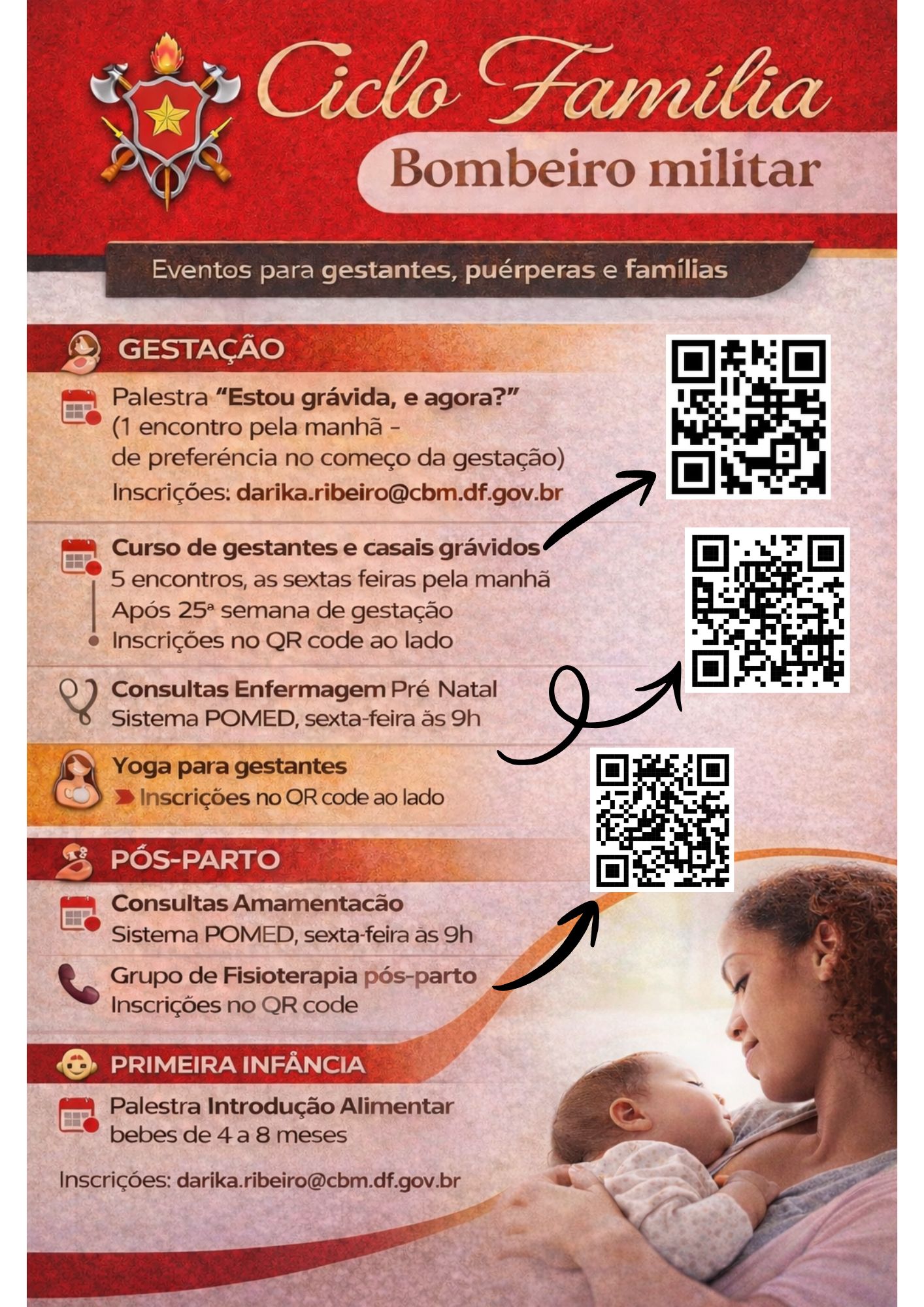 O Corpo de Bombeiros Militar do Distrito Federal (CBMDF), por meio da Diretoria de Saúde, promove o Ciclo Família – Bombeiro Militar, iniciativa voltada à promoção da saúde materno-infantil e ao apoio às famílias desde o período gestacional até os primeiros meses de vida da criança.