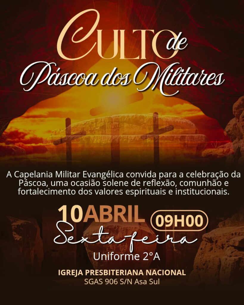 O Comandante-Geral convida os militares evangélicos do expediente a participarem do Culto da Páscoa dos Militares 2026, uma ocasião solene de reflexão, comunhão e fortalecimento dos valores espirituais e institucionais, conforme segue: