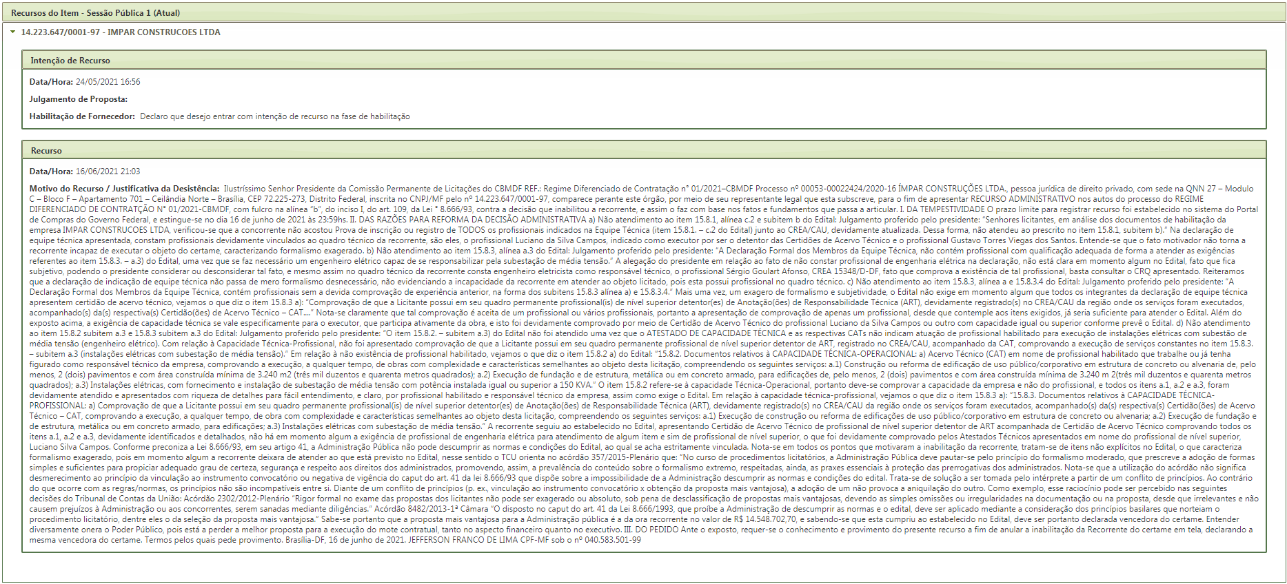 Às 15:26 horas do dia 06 de julho de 2021, após constatada a regularidade dos atos procedimentais, a autoridade competente, Sr(a) |