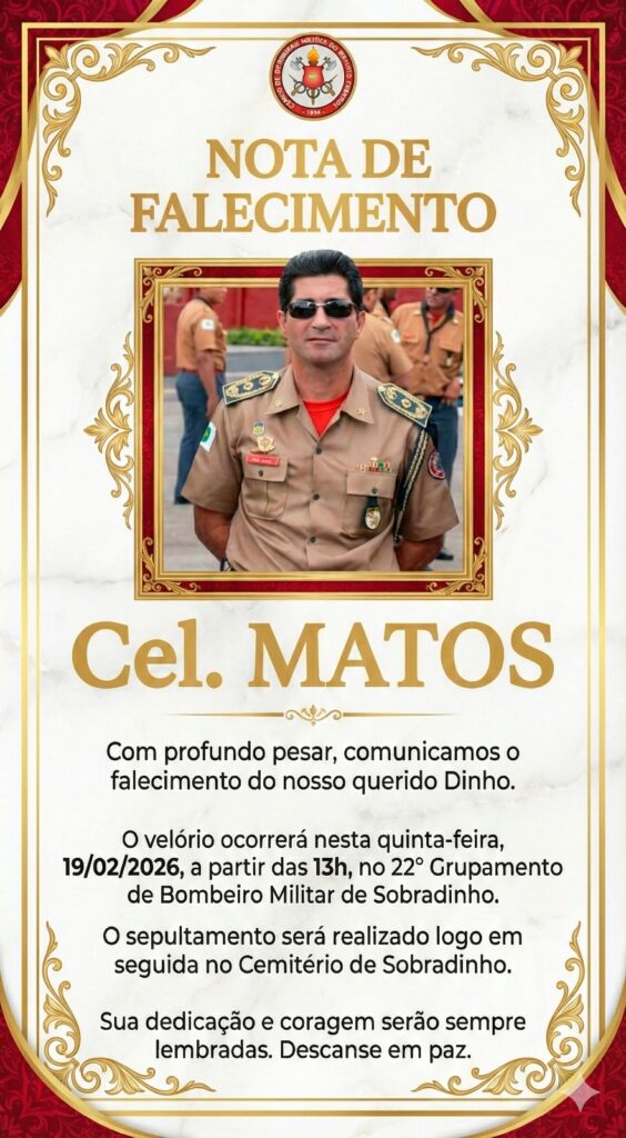 O CBMDF manifesta profundo pesar pelo falecimento do Coronel Epaminondas Figueiredo de Matos, ex-Subcomandante-Geral do CBMDF, ocorrido em 17 de fevereiro de 2026, às 13h40, em decorrência de parada cardiorrespiratória.