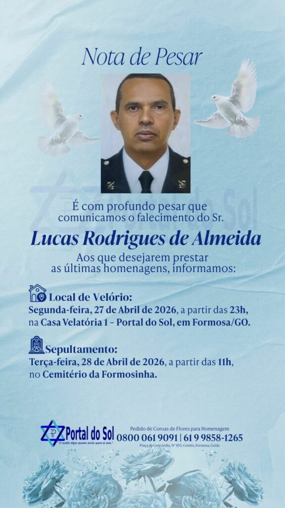 - Velório: 27 de abril (segunda-feira), a partir das 23h na Casa Velatória 1 – Portal do Sol, em Formosa/GO
