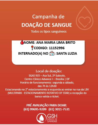 O CBMDF solicita doação de sangue voluntária para Ana Maria Lima Brito