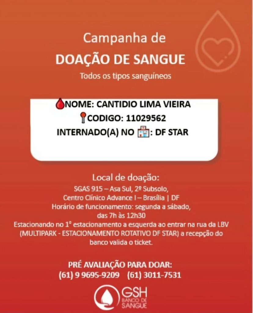 O CBMDF solicita doação de sangue voluntária para Cantidio Lima Vieira
