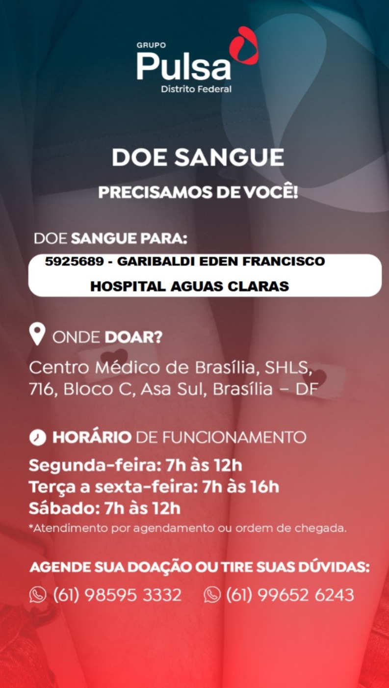 Local para doação: Centro Medico de Brasília, SHLS, 716, Bloco C, Asa Sul, Brasília- DF