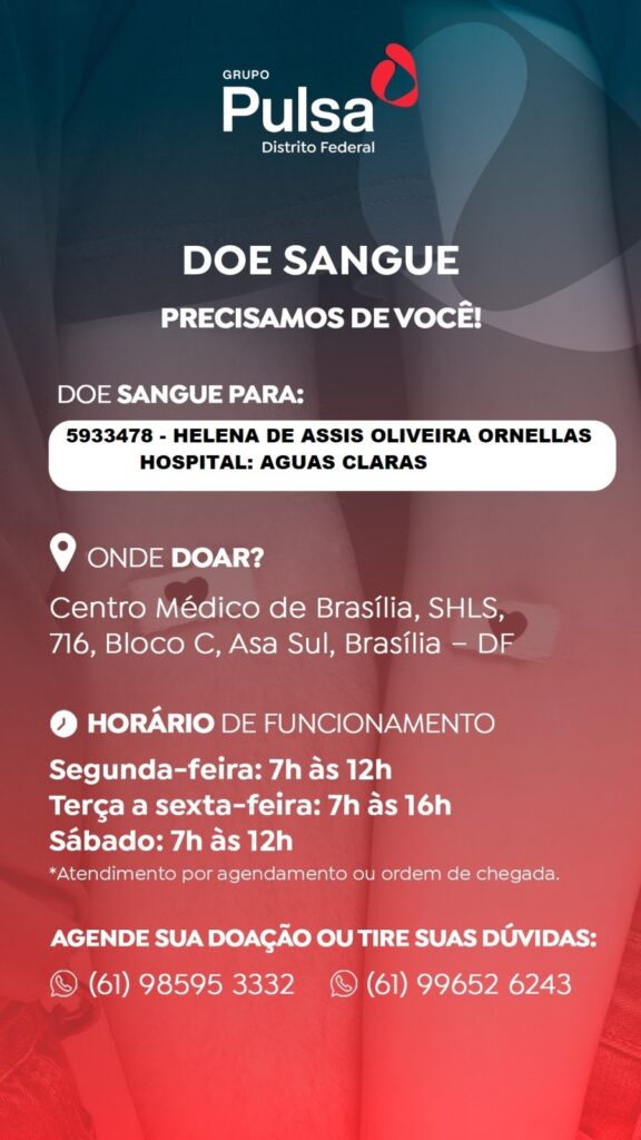 Local para doação: Centro Medico de Brasília, SHLS, 716, Bloco C, Asa Sul, Brasília- DF