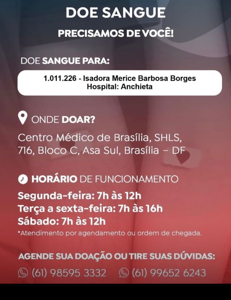Local para doação: Centro Medico de Brasilia, SHLS, 716, Bloco C, Asa Sul, Brasilia- DF