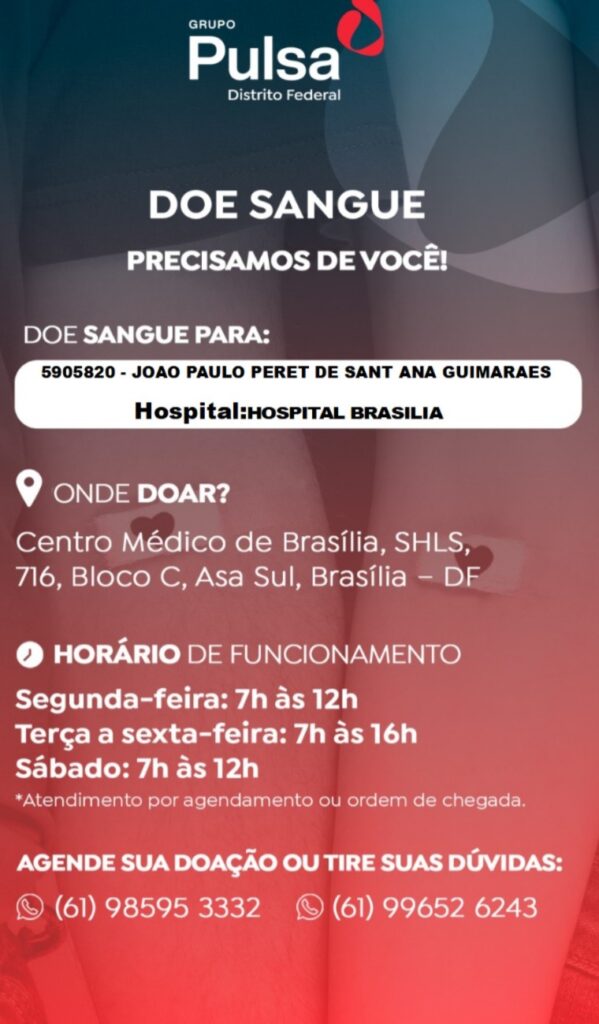 O CBMDF solicita doação de sangue voluntária para João Paulo Peret de Sant Ana Guimarães.