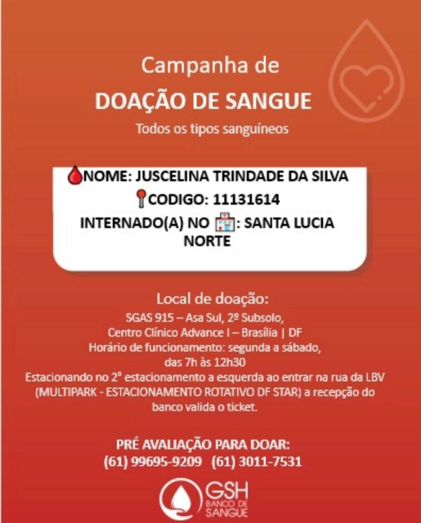 Local para doação: Banco de Sangue de Brasília.