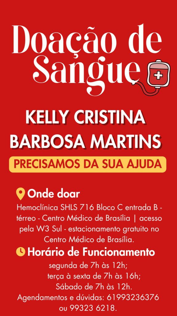 O CBMDF solicita doação de sangue voluntária para:Kelly Cristina Barbosa Martins