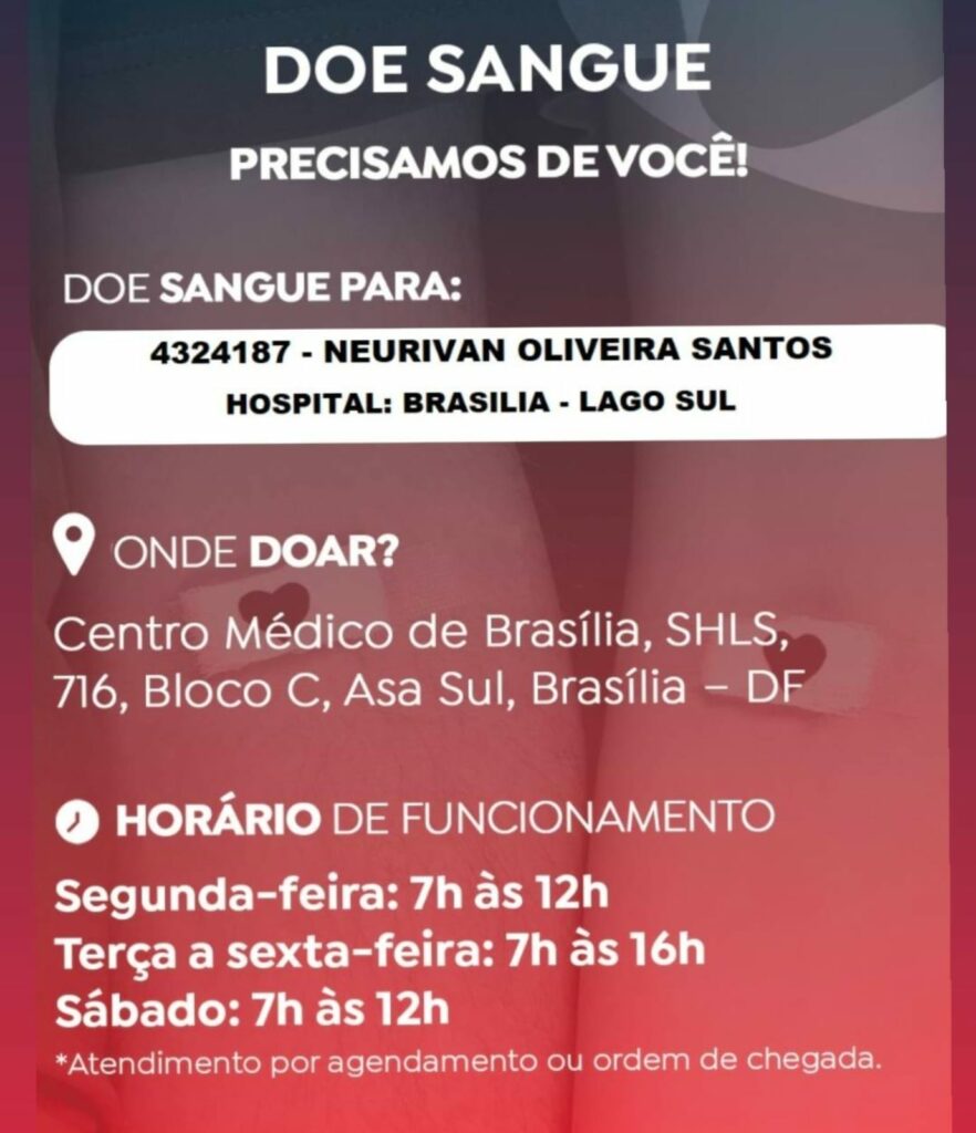 O CBMDF solicita doação de sangue voluntária para Neurivan Oliveira Santos
