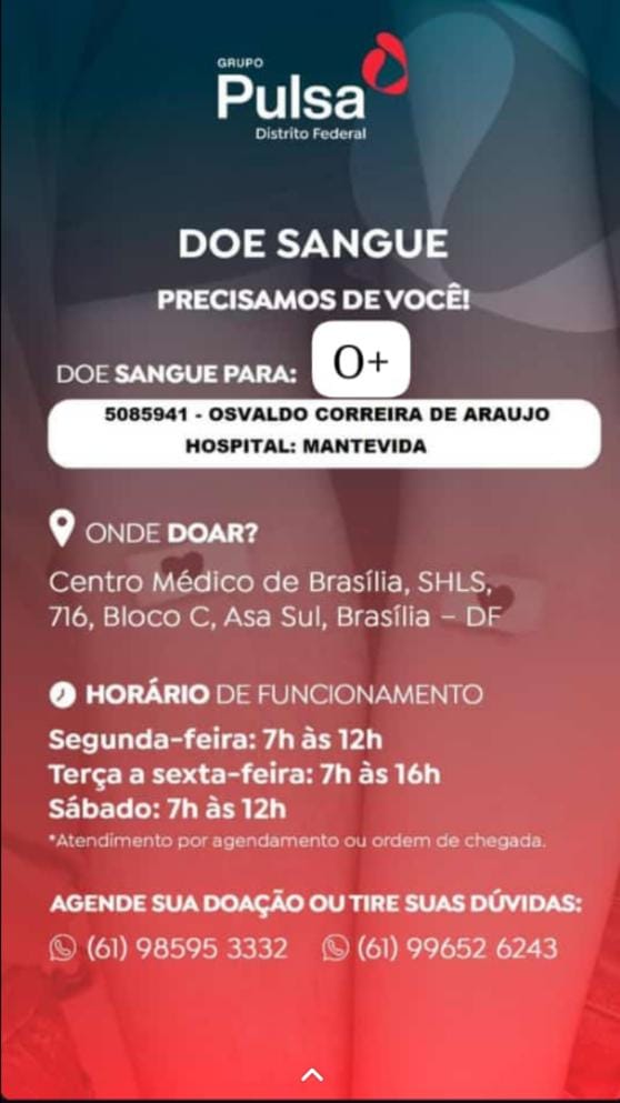 O CBMDF solicita doação de sangue voluntária para: Osvaldo Correira de Araujo