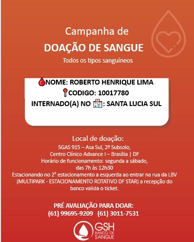 O CBMDF solicita doação de sangue voluntária para Roberto Henrique Lima