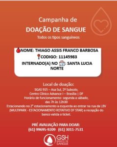 O CBMDF solicita doação de sangue voluntária para Thiago Assis Franco Barbosa