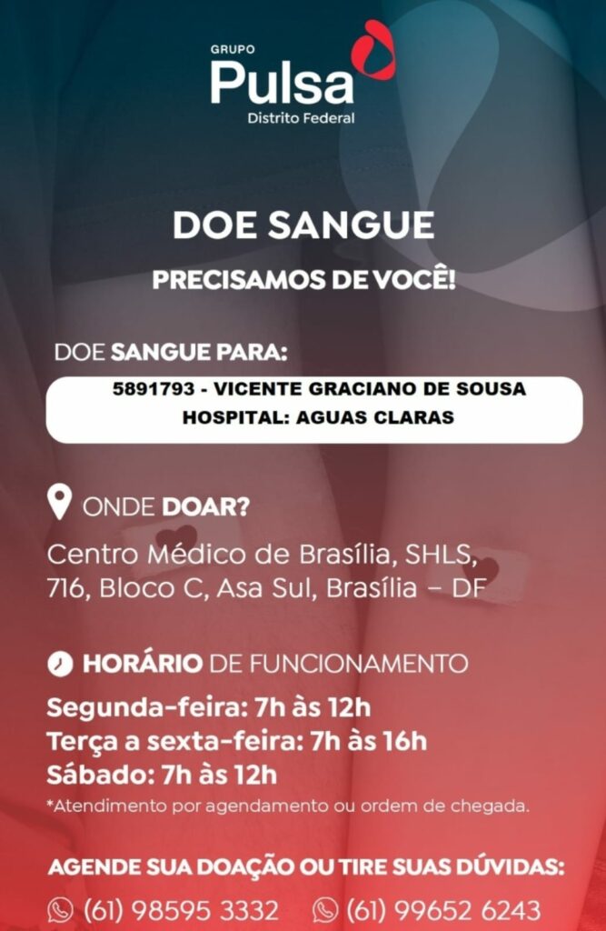 O CBMDF solicita doação de sangue voluntária para Vicente Graciano De Sousa