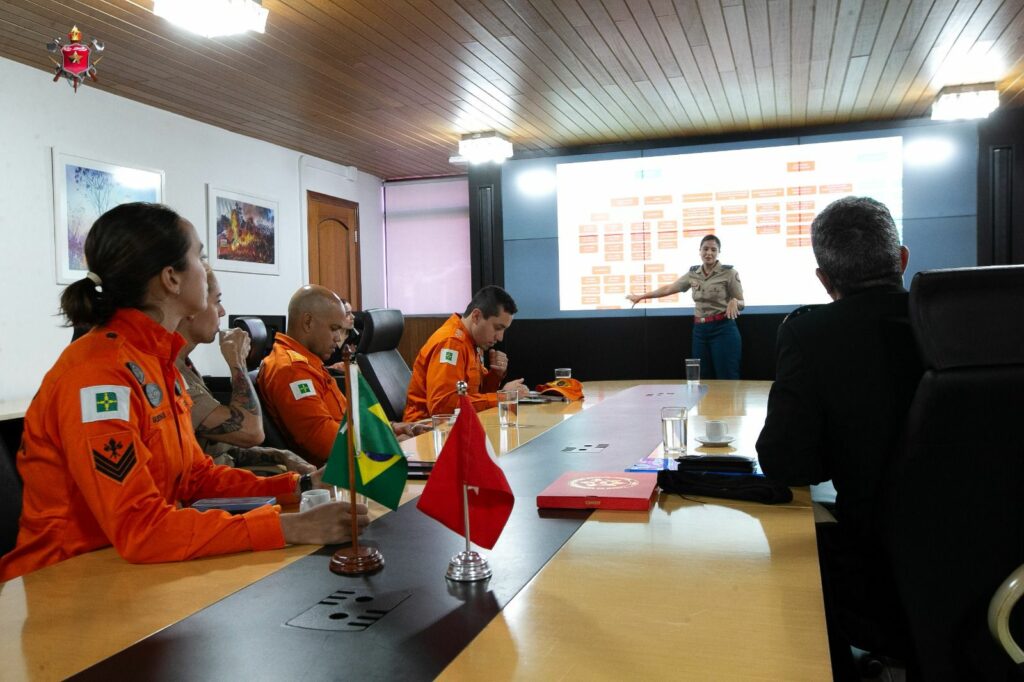 A 1ª Tenente Tassiana, Chefe da ASCOP, conduziu uma apresentação sobre o organograma e a organização do CBMDF, além de destacar alguns cursos oferecidos pela corporação e as cooperações realizadas com instituições nacionais e internacionais.